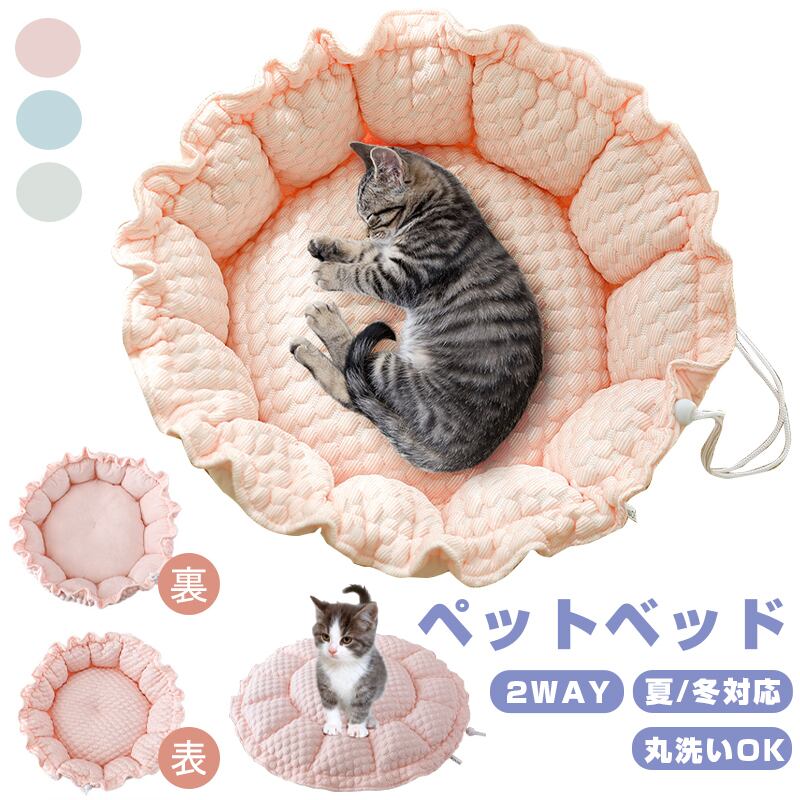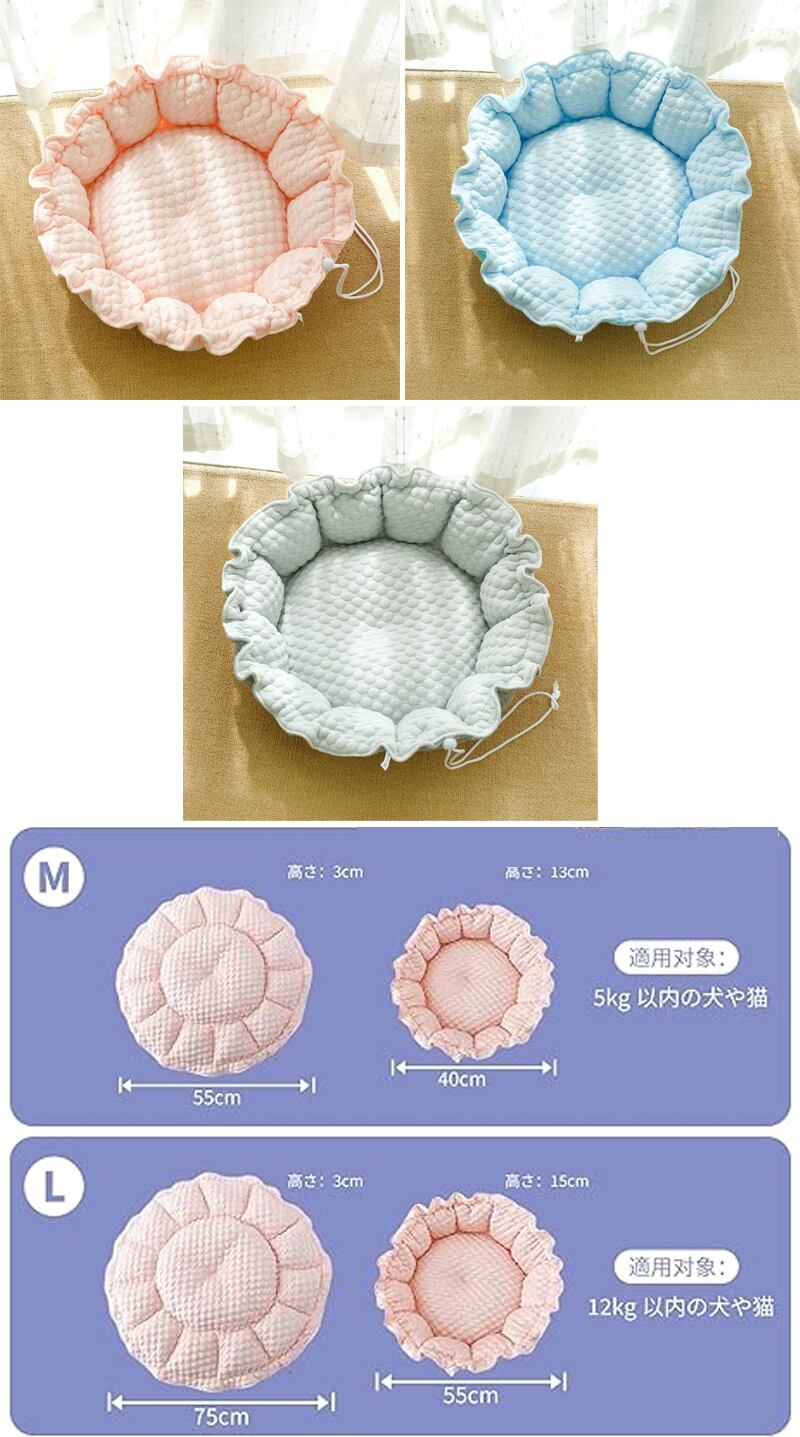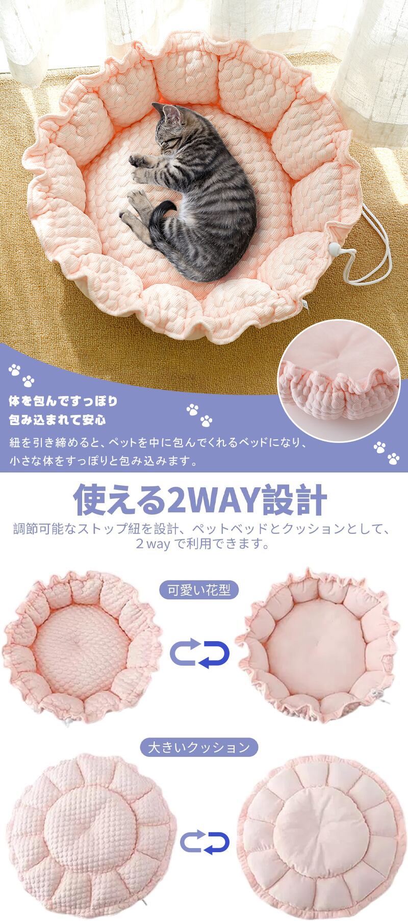 【使える2WAY設計】調節可能なストップ紐を設計、ペットベッドとクッションとして、2wayで利用可能です。ペットの好みに合わせて自由に形を調整できます。<BR>可愛い花型のデザインがペットの体を丸く包まれ、安心感を与えてくれます。<BR>クッションとしても便利で、リビング、キッチン、庭、ケージなど様々な場所でお使いいただけます。さらに、空間が広く開放的で快適な寝心地を実現し、様々な空間のニーズに応えます。