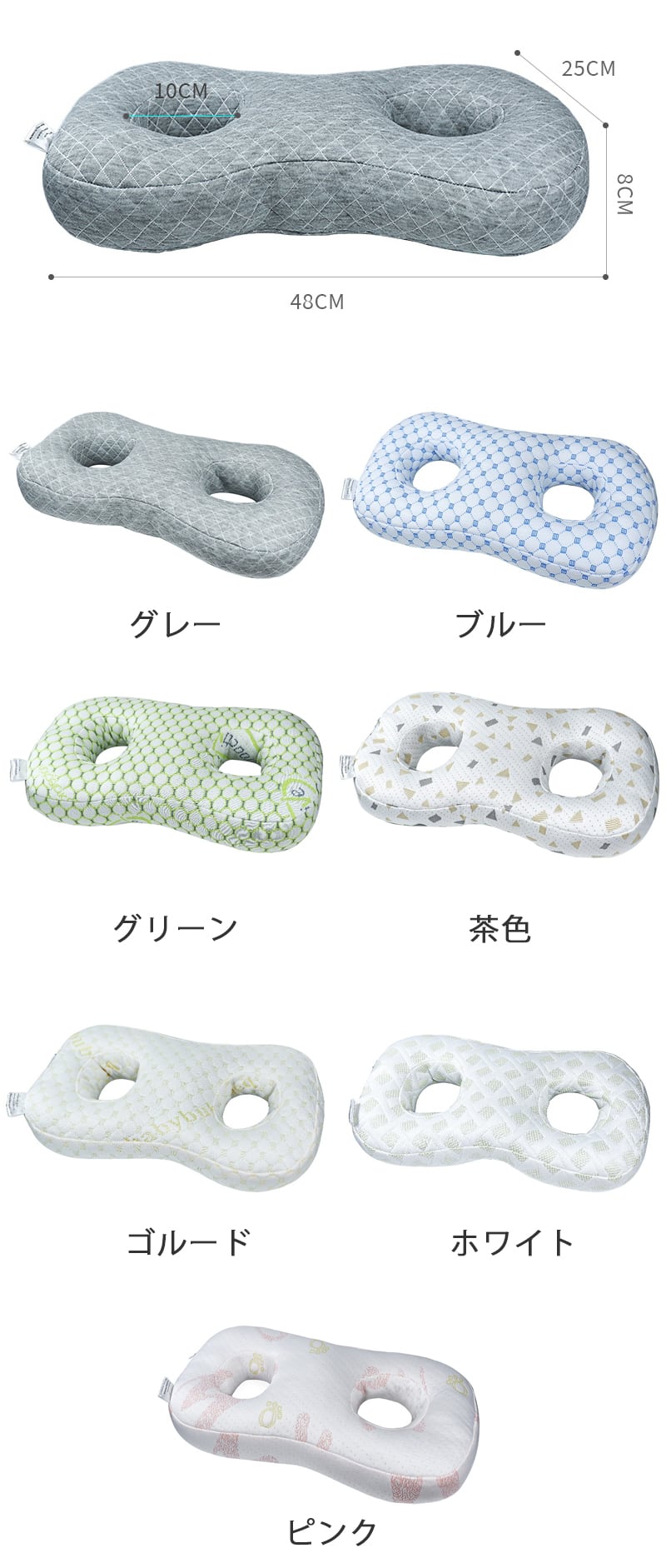 中央が空洞で耳穴が開いた人間工学に基づいたデザインのこの枕は、横向き寝の方に最適です。安定したサポートで快適な睡眠をサポートします。<BR>